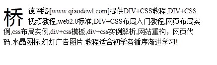 <p>桥德网络[www.qiaodewl.com]提供DIV+CSS教程,DIV+CSS视频教程,web2.0标准,DIV+CSS布局入门教程,网页布局实例,css布局实例,div+css模板,div+css实例解析,网站重构,网页代码,水晶图标,幻灯广告图片.教程适合初学者循序渐进学习!</p>